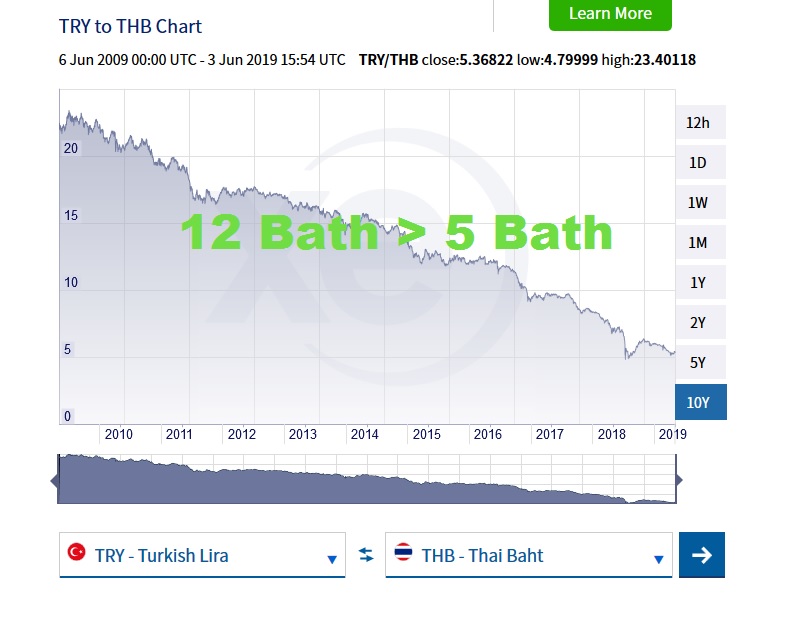 1. ตุรกี เจออเมริกาเพิ่มภาษีนำเข้าเหล็ก ทำให้ค่าเงินลดลงถึง 50 % ถ้าดูกราฟ 10 ปี จาก 20 บาท ตอนนี้เหลือ แค่ 5.3 – 5.5 บาทต่อ 1 Lira ฟรีวีซ่า คุ้มค่าที่จะไปมากๆ ถูกลงมาก