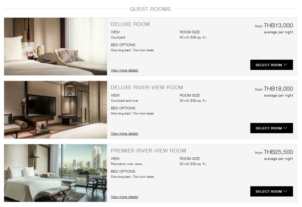 ราคารวมอาหารเช้า ประมาณ 17500 บาท ราคาแพงกว่า Park Hyatt Bangkok และ Rosewood Bangkok แต่ก็ยังถูกกว่า Mandarin Oriental Bangkok ที่เพิ่งรีโนเวทใหม่