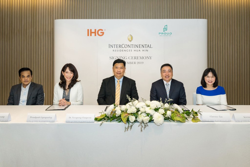 บริษัท พราว เรียล เอสเตท จำกัด (มหาชน) โดย ดร.วีระพงศ์ ไชยเพิ่ม (กลาง) รองประธานคณะกรรมการบริษัท ร่วมด้วย นางสาวพราวพุธ ลิปตพัลลภ (ที่ 2 จากซ้าย) กรรมการบริหาร และนายจันทร จันทราทิพย์ (ซ้ายสุด) ผู้ช่วยกรรมการผู้จัดการใหญ่ ร่วมลงนามในบันทึกข้อตกลงความร่วมมือ (MOU) กับ อินเตอร์คอนติเนนตัล โฮเทล กรุ๊ป (ไอเอชจี) โดย นายคลาเรนซ์ แทน (ที่ 2 จากขวา) กรรมการผู้จัดการ กลุ่มธุรกิจโรงแรม และ นางสาวเซรีน่า ลิม (ขวาสุด) รองประธาน ฝ่ายพัฒนาธุรกิจ ภูมิภาค เอเชียตะวันออกเฉียงใต้และเกาหลี เพื่อพัฒนาโครงการ “อินเตอร์คอนติเนนตัล เรสซิเดนเซส หัวหิน (InterContinental Residences Hua Hin)”