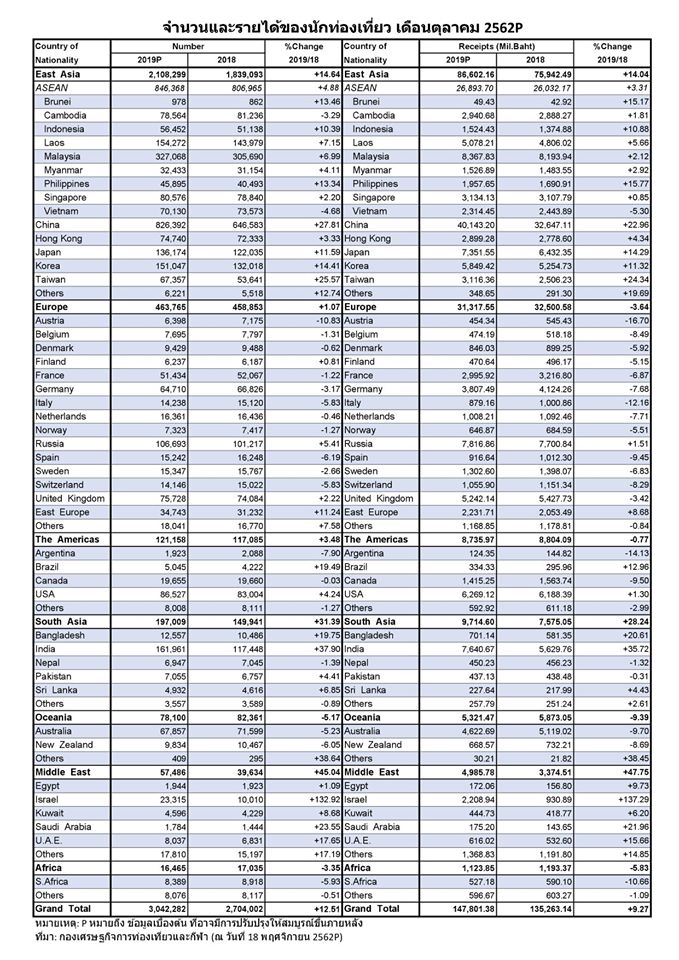 ตัวเลขนักท่องเที่ยว เดือน ตุลาคม ที่ผ่านมา