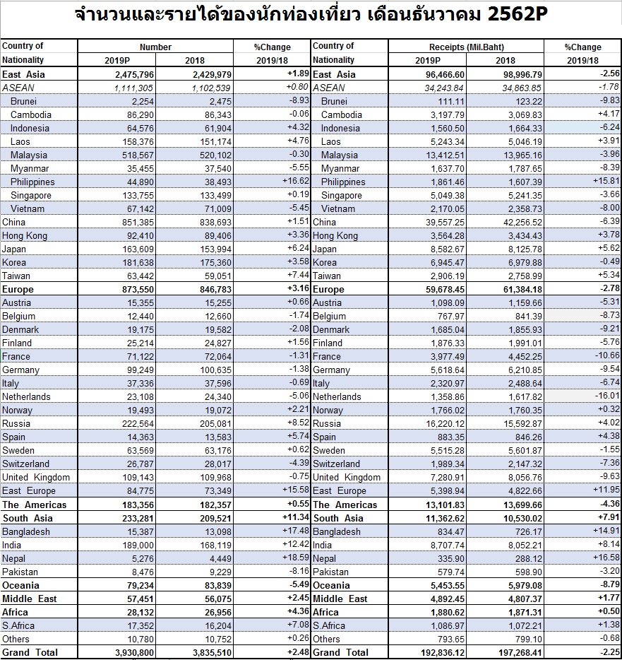 ตัวเลขนักท่องเที่ยวเดือน ธันวาคม 19