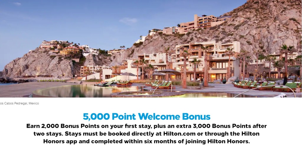 Earn 2,000 Bonus Points on your first stay, plus an extra 3,000 Bonus Points after two stays. Stays must be booked directly at Hilton.com or through the Hilton Honors app and completed within six months of joining Hilton Honors.