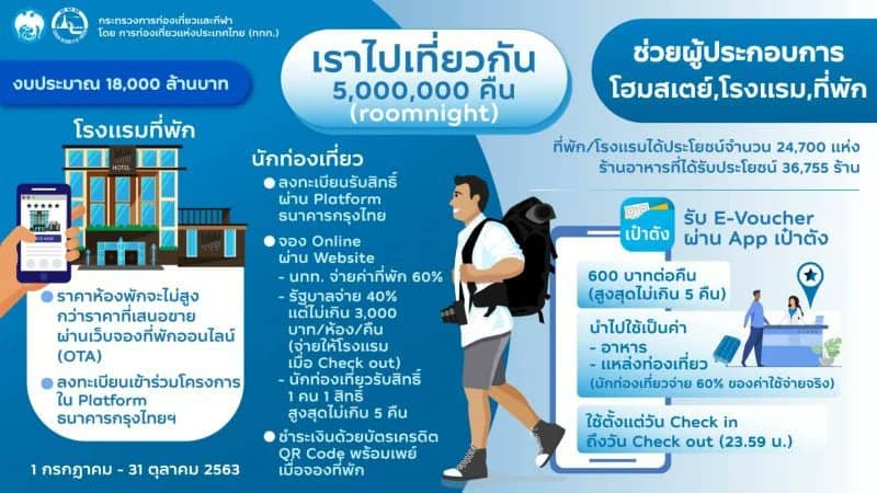 2. แพ็คเกจ “เราไปเที่ยวกัน” เป็นการกระตุ้นการเดินทางท่องเที่ยวภายในประเทศของคนไทย โดยรัฐบาลจะสนับสนุนค่าใช้จ่ายโรงแรม ที่พักในอัตรา 40% ต่อคืน ไม่เกิน 3,000 พันบาทต่อคืน สูงสุดไม่เกิน 5 คืน หรือ 15,000 บาท และสนับสนุนเงินในลักษณะวงเงินอีวอลเล็ท หรือเงินอิเล็กทรอนิกส์ ให้ 600 บาทต่อคืน สูงสุดไม่เกิน 5 คืน หรือ 3,000 บาท เพื่อให้นำไปใช้จ่ายกิจกรรมในด้านการท่องเที่ยวอื่นๆเช่นใช้บริการสปา ซื้อของที่ระลึก ร้านอาหาร แต่ไม่ได้นำไปใช้จ่ายภายในระยะเวลาการเดินทางท่องเที่ยวก็จะถูกยึดคืน