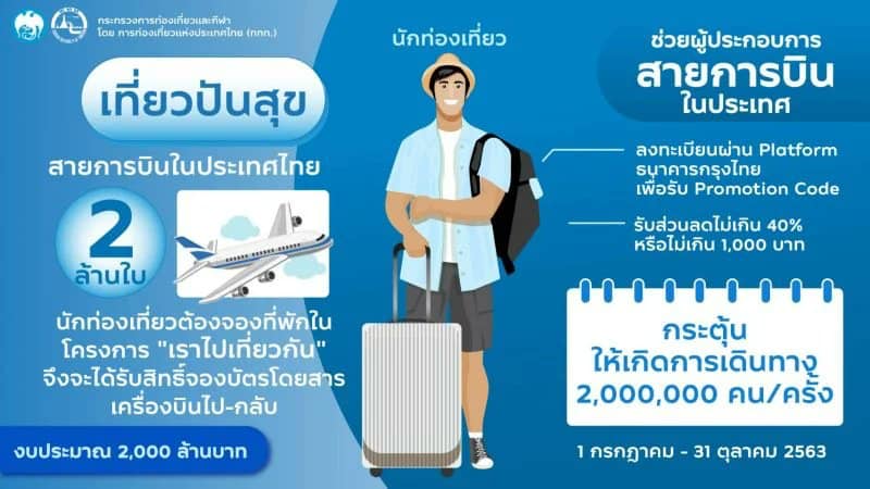 1. แพ็คเกจ “เที่ยวปันสุข” เพื่อช่วยเหลือสายการบินต้นทุนต่ำ รถเช่า โดยรัฐสนับสนุนค่าใช้จ่ายค่าเดินทางในอัตรา 40% แต่ไม่เกิน 1,000 บาท โดยได้มีการหารือกับสายการบินต้นทุนต่ำที่เข้าร่วมโครงการให้กำหนดราคาขายตั๋วเครื่องบินเในประเทศไป-กลับ ในราคา 2,500 บาท