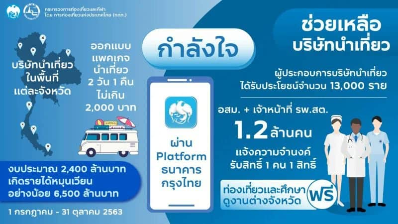 และ 3. แพ็คเกจ “กำลังใจ” เพื่อตอบแทนบุคลากรแนวหน้าในการรับมือโควิด-19 โดยให้อาสาสมัครสาธารณสุขประจำหมู่บ้าน (อสม.) และเจ้าหน้าที่โรงพยาบาล ส่งเสริมสุขภาพตำบล (รพ.สต.) รวม 1.2 ล้านคน โดยจะให้ได้รับสิทธิพิเศษเดินทางท่องเที่ยวฟรีผ่านบริษัทนำเที่ยว 2 วัน 1 คืน โดยรัฐบาลจะสนับสนุนค่าใช้จ่ายให้ 2,000 บาทต่อคน
