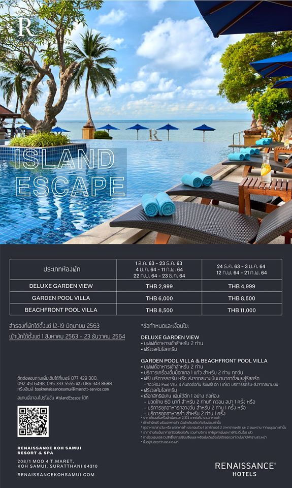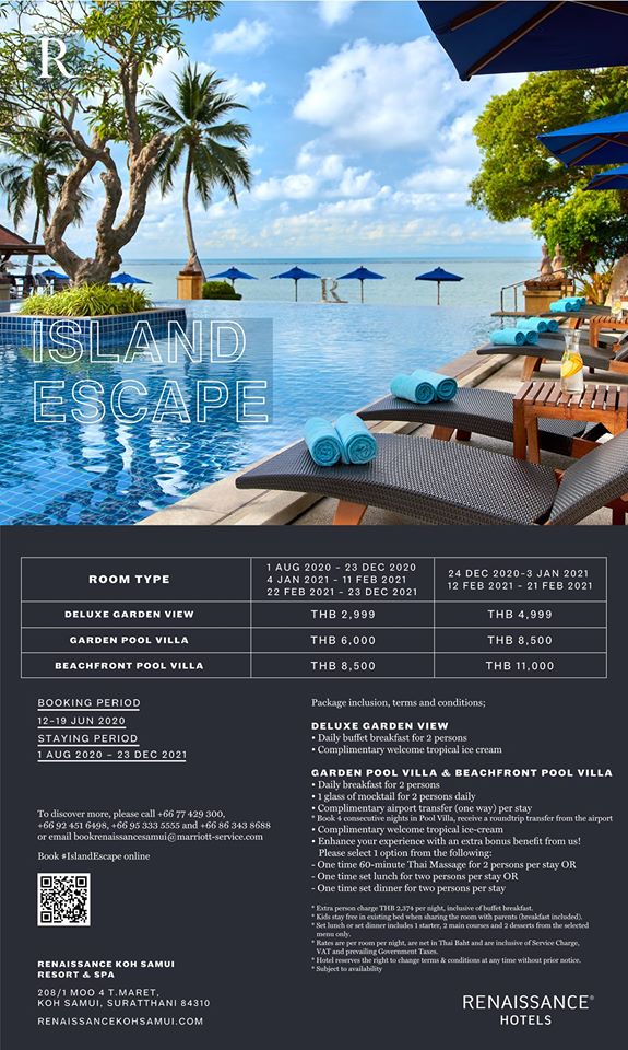 For more information, please contact +66 77 429 300, +66 92 451 6498, +66 95 333 5555 and +66 86 343 8688 or email: bookrenaissancesamui@marriott-service.com