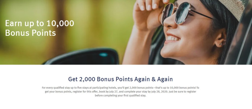 For every qualified stay up to five stays at participating hotels, you’ll get 2,000 bonus points—that’s up to 10,000 bonus points!To get your bonus points, register for this offer, book by July 27, and complete your stay by July 28, 2020. Just be sure to register before completing your first qualified stay.