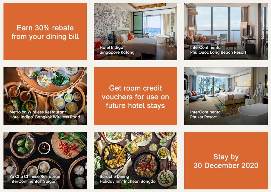 Diners of restaurants and bars at participating IHG® hotels will receive a room credit voucher of USD$30 with every USD$90* (before taxes, gratuities and services charges) spent within one single bill which will be notified to you by participating restaurants and bars. This dining offer may apply for room service, dine-in, take away and deliveries which will be notified to you by participating restaurants and bars.