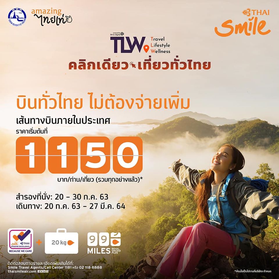 บินไทยสมายล์ ไม่ต้องจ่ายเพิ่ม เที่ยวทั่วไทยในโครงการ ‘เราเที่ยวด้วยกัน’ สำรองบัตรโดยสารไทยสมายล์ผ่านช่องทางใดก็ได้ เพื่อรับสิทธิ์เงินคืนจากโครงการฯ 40% สูงสุด 1,000 บาท