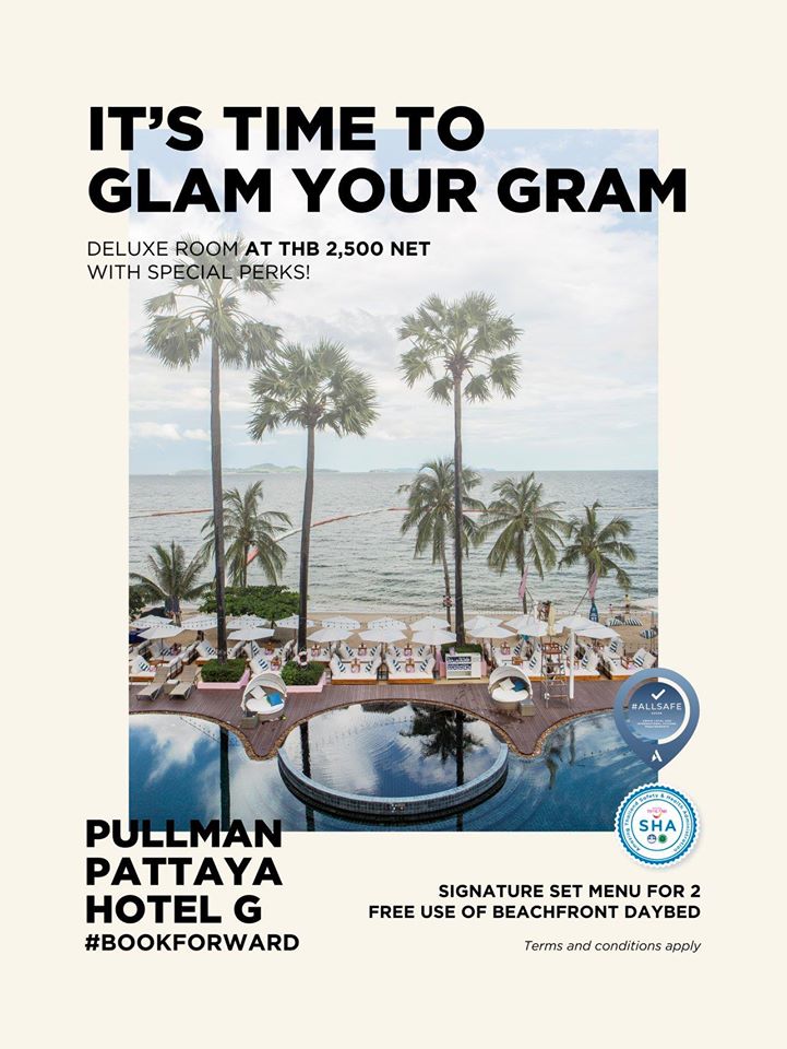 มากกว่าคำว่าฟินก็โปร Glam Your Gram ของพูลแมน พัทยา จี เนี่ยแหละ! พบกับดีลสุดคุ้ม ห้องพัก Deluxe ราคาสุทธิเพียง 2,500 บาท สำหรับเข้าพักวันอาทิตย์ – วันศุกร์* พร้อมอาหารเช้าสำหรับ 2 ท่าน แถมยังมีเบอร์เกอร์ที่อร่อยที่สุดในสามโลกจาก 25 Degrees Bangkok และเซ็ตอาหารสุดพิเศษจาก The Beach Club Pattaya พร้อมสิทธิในการใช้เดย์เบดริมหาดมูลค่า 1,000 บาทฟรี!