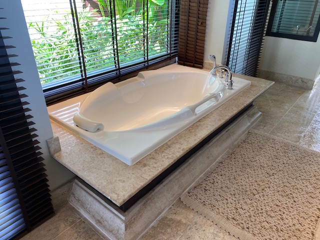 อ่างอาบน้ำใหญ่อลังการสุดๆ ดีไซต์ให้เห็นต้นไม้ อารมณ์สไตล์บาหลี ฝักบัวอาบน้ำ