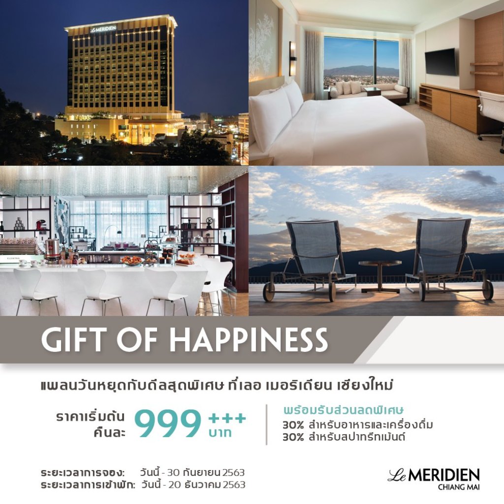 #GiftOfHappiness เที่ยวเชียงใหม่แบบสุดคุ้ม กับดีลห้องพักราคาดีที่สุด! ที่โรงแรมเลอ เมอริเดียน เชียงใหม่มอบให้เป็นของขวัญสุดพิเศษให้กับคุณและคนที่คุณรัก ห้องพักราคาเริ่มต้นเพียงคืนละ 999+++ บาท และอาหารเช้าราคาพิเศษ เพียง 250++ บาท ต่อท่าน พร้อมแฮปปี้แบบเต็มอิ่มกับส่วนลดที่ร้านอาหาร บาร์ และเดอะสปา อีก 30% จากราคาปกติ โอกาสดีดี แบบนี้พลาดไม่ได้แล้ว