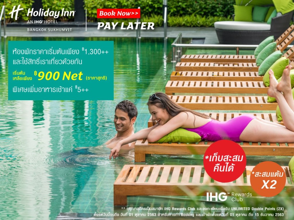 - กรุณาสมัครเป็นสมาชิก IHG Rewards Club และลงทะเบียนเพื่อรับ UNLIMITED Double Points (2X) ตั้งแต่วันนี้จนถึง วันที่ 1 ตุลาคม 2563 สำหรับการทำจองห้องพัก และเข้าพักตั้งแต่วันที่ 1 ตุลาคม ถึง 15 ธันวาคม 2563