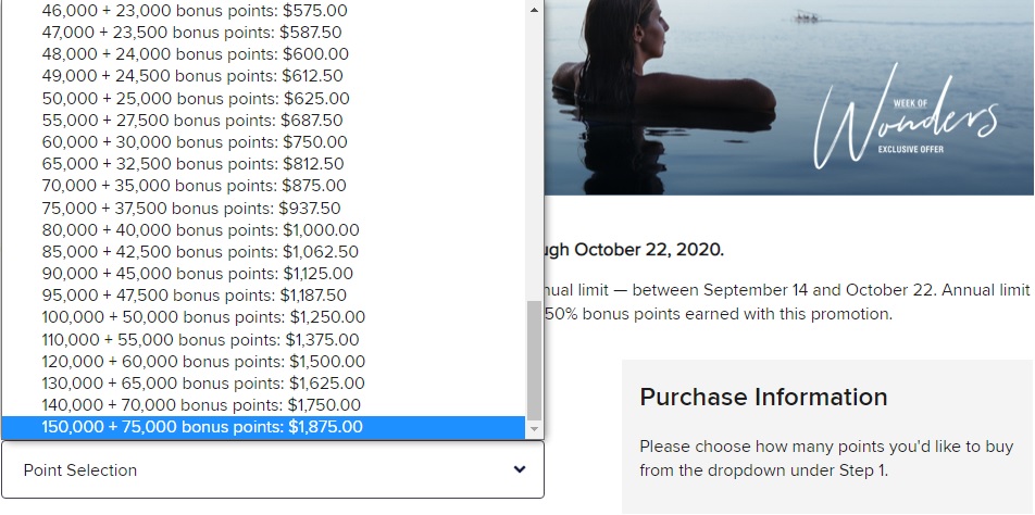 - A member may purchase or receive as a gift from another member a combined maximum of 150,000 Points during the promotional period only. Points that have been already purchased or received as a gift in 2020 are included in the 150,000 Points limit. The 50% bonus Points earned with this promotion are not included in the 150,000 Points limit.