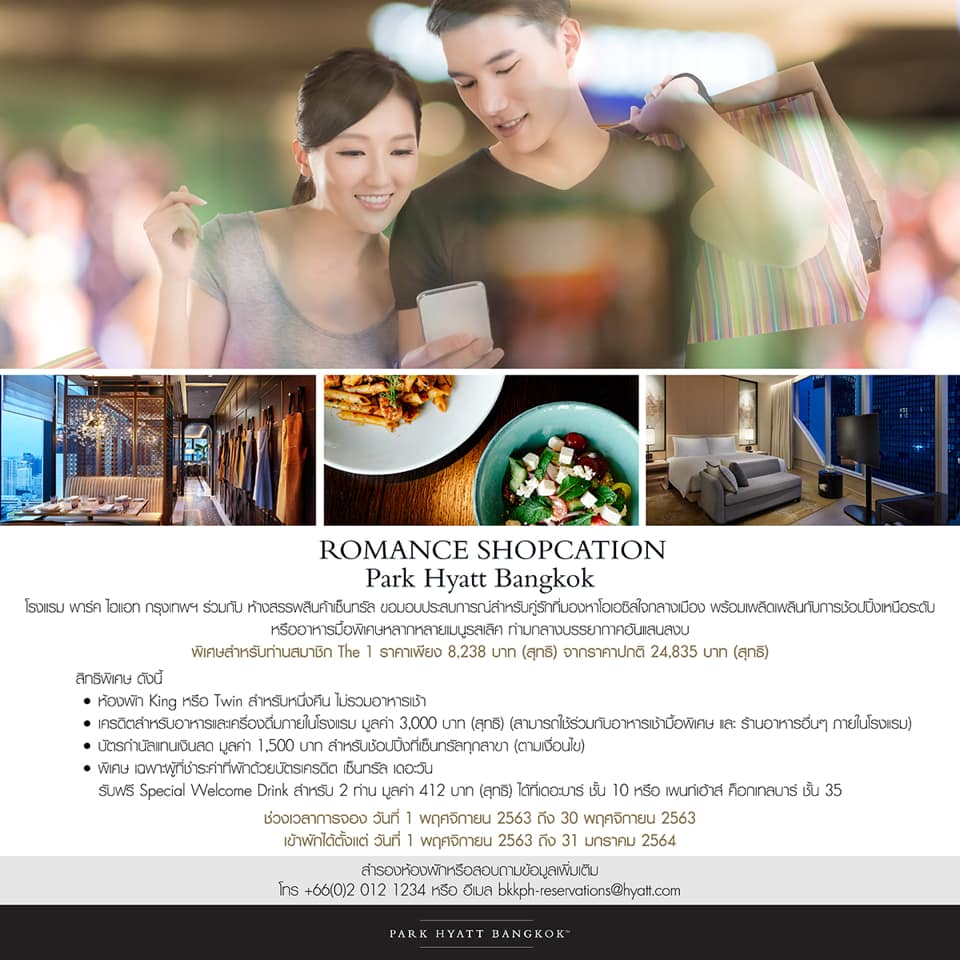 Romance Shopcation โปรโมชั่นสุดพิเศษที่พาร์ค ไฮแอท กรุงเทพฯ ร่วมกับ ห้างสรรพสินค้าเซ็นทรัล เชิญคู่รักที่มองหาโอเอซิสใจกลางเมือง พร้อมเพลิดเพลินกับการช้อปปิ้งอย่างเหนือระดับ กับแพ็คเก็จราคา 8,238 บาทสุทธิ จากราคาปกติ 24,835 บาทสุทธิ พร้อมรับสิทธิพิเศษอีกมากมาย