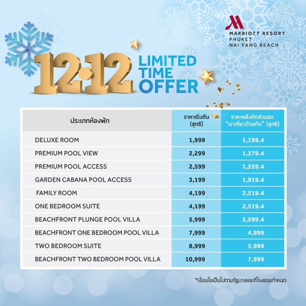 🎄 Phuket Marriott Resort and Spa, Nai Yang Beach มีของขวัญส่งท้ายปีมามอบให้กับทุกคนด้วยราคาห้องพักสุดพิเศษกับ “โปรโมชั่น 𝟭𝟮.𝟭𝟮 𝗟𝗶𝗺𝗶𝘁𝗲𝗱 𝗧𝗶𝗺𝗲 𝗢𝗳𝗳𝗲𝗿”