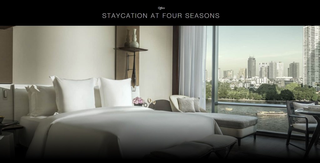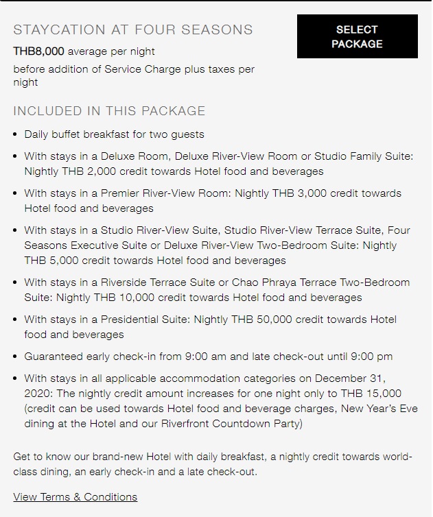 - With stays in a Studio River-View Suite, Studio River-View Terrace Suite, Four Seasons Executive Suite or Deluxe River-View Two-Bedroom Suite: THB 5,000 credit towards Hotel food and beverages