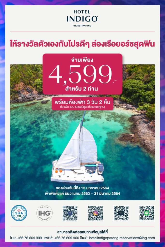 ด้วยโปรดีๆ กับการ #ล่องเรือยอร์ชสุดฟิน !! พร้อมเข้าพักที่โรงแรมโฮเต็ล อินดิโก้ ภูเก็ต ป่าตอง 3 วัน 2 คืน ✨🎉✨ เพียง 4,599 บาท สำหรับ 2 ท่าน ✅ จองได้ตั้งแต่วันนี้ถึง 15 มกราคม 2564 ✅ เข้าพักได้ตั้งแต่วันนี้ 2563 จนถึง 31 มีนาคม 2564 ✨ สิ่งที่รวมในแพคเกจ
