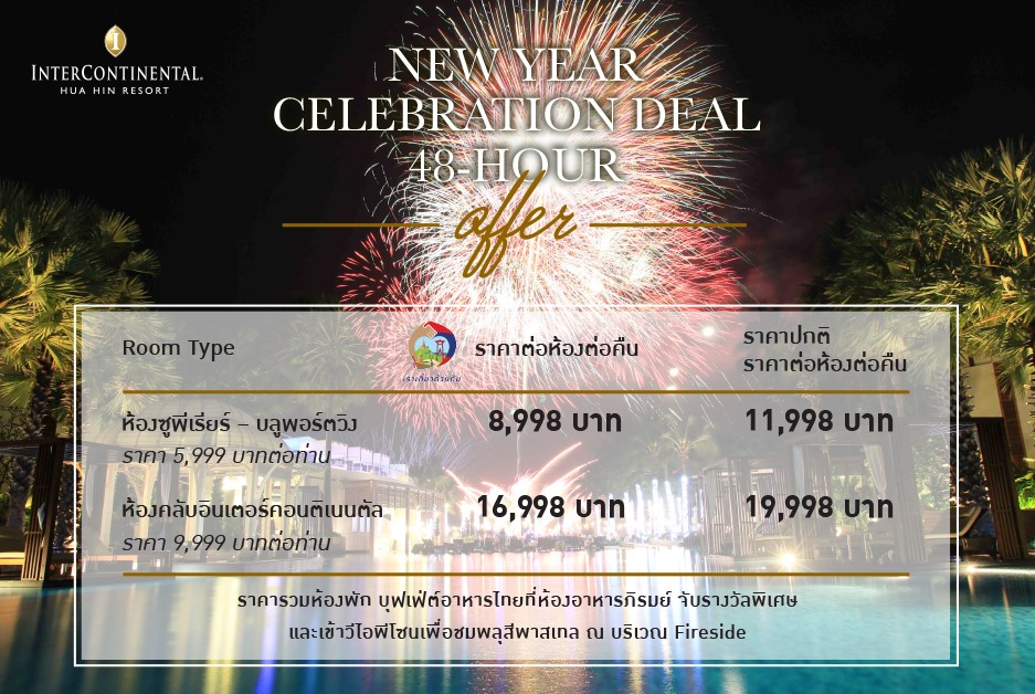 🎇 ฉลองการส่งท้ายปีเก่าและต้อนรับปีใหม่ไปพร้อมกับคนพิเศษและคนในครอบครัว ท่ามกลางเสียงดนตรี พร้อมสัมผัสรสชาติอาหารไทยแท้กับบุฟเฟ่ต์ที่รังสรรค์โดยทีมเชฟมากประสบการณ์ นำเมนู 4 ภาคของประเทศไทยมารวมไว้ที่ห้องอาหารภิรมณ์ จากนั้นร่วมนับถอยหลังสู่ปีใหม่และตื่นตาตื่นใจกับพลุสีพาสเทลสุดตระการตาที่ใหญ่ที่สุดในหัวหินบริเวณหน้าหาด พร้อมลุ้นรับรางวัลที่พักในเครือ โรงแรมและรีสอร์ทของ อินเตอร์คอนติเนนตัล ✨