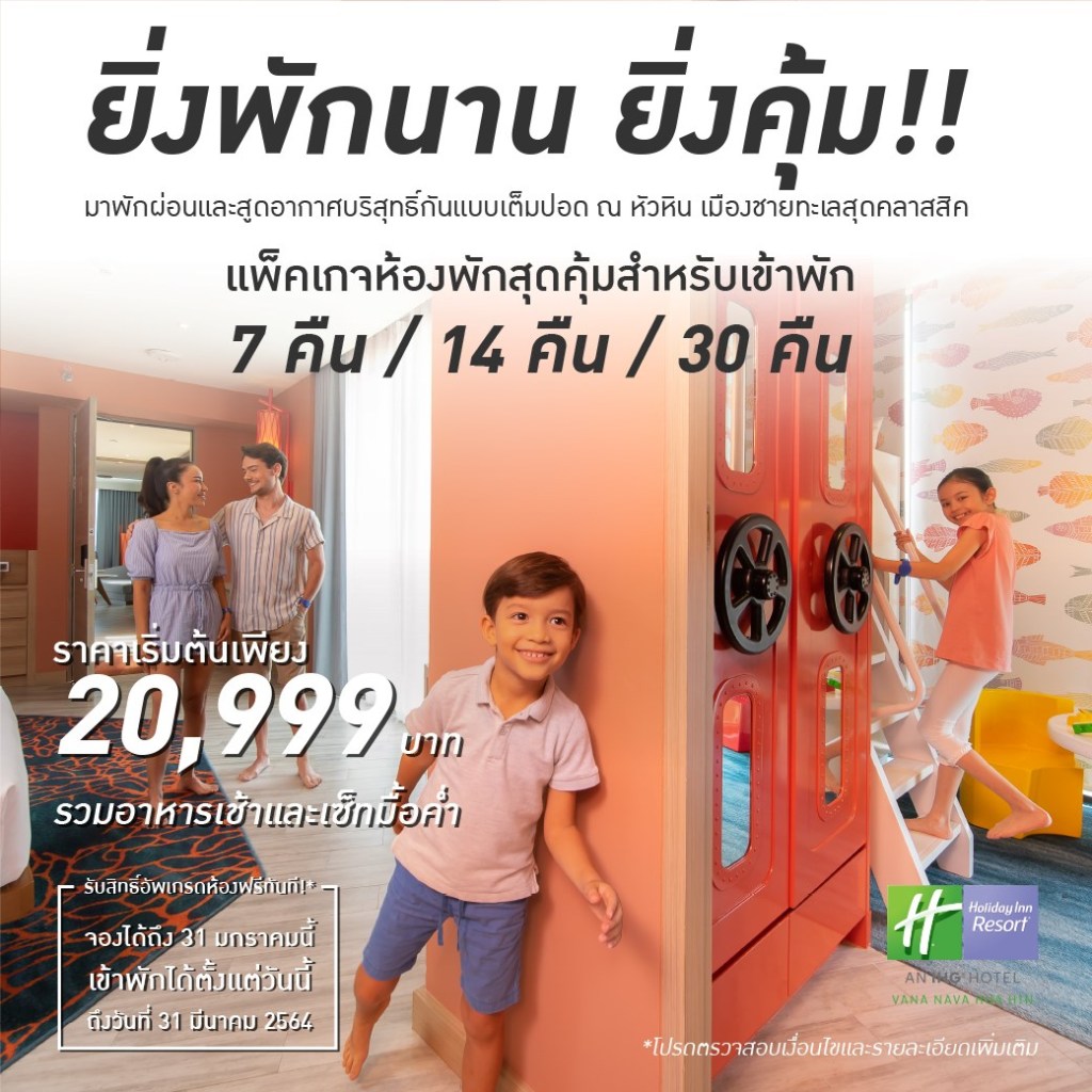 ยิ่งพักนานยิ่งคุ้ม!! มาพักผ่อนและสูดอากาศบริสุทธิ์กันแบบเต็มปอด ณ หัวหิน เมืองชายทะเลสุดคลาสสิค ด้วยแพ็คเกจห้องพักสุดคุ้ม เข้าพัก 7 คืน 14 คืน หรือ 30 คืน #ราคาเริ่มต้นเพียง 20,999 บาท รวมอาหารเช้าและเซ็ทมื้อค่ำ รับสิทธิ์ #อัพเกรดห้องฟรีทันที!*