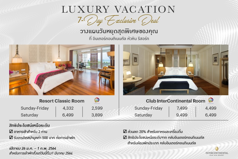 📣 Plan your luxurious weekend getaway in our Resort Classic or Club InterContinental® Hua Hin room and get an exclusive add-on benefit and Club InterContinental® privilege with special price offer starts from 𝐨𝐧𝐥𝐲 𝐓𝐇𝐁 𝟒,𝟑𝟑𝟐 𝐧𝐞𝐭* #7DaysOnly.💥