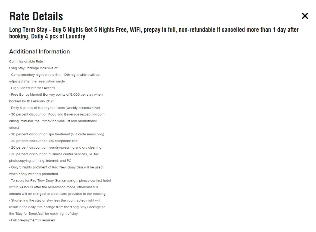 • หากเช็กเอาต์ก่อนกำหนด หรือเข้าพักน้อยกว่าจำนวนระยะเวลาที่ทำสัญญา ราคาห้องพักจะกลายเป็นแพ็คเกจห้องรวมอาหารเช้าปกติ โดยคิดตามจำนวนวันที่เข้าพัก