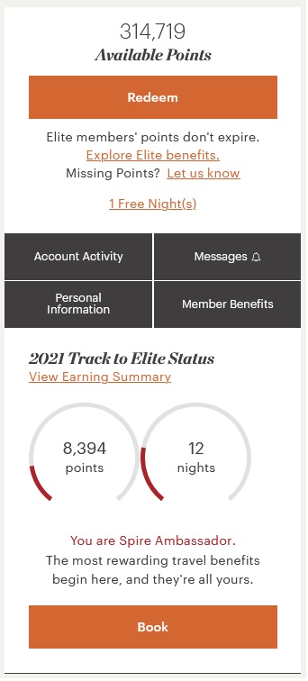 “For Gold, Platinum, and Spire Elite members, all qualifying nights stayed in 2020 will be rolled over into 2021 and count towards status earned in 2021”