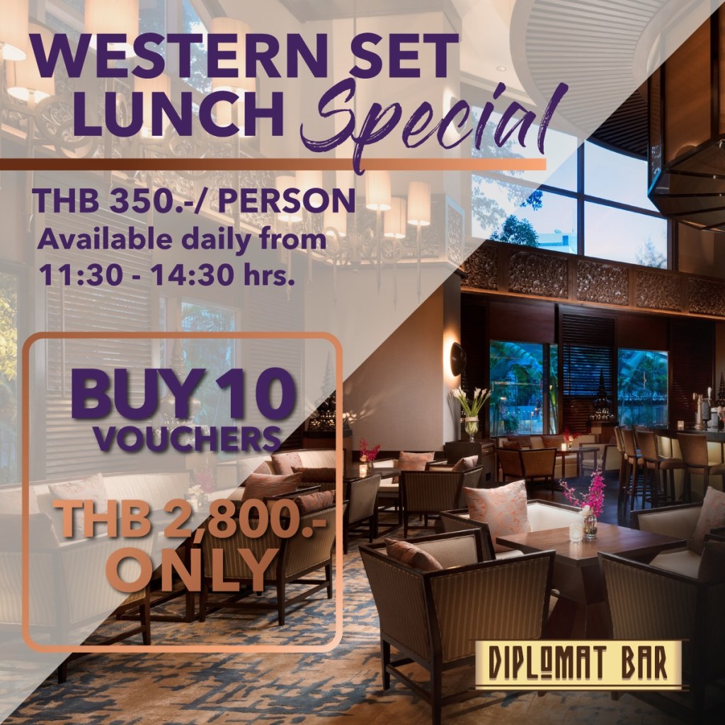 ⚡ เซตอาหารตะวันตกมื้อกลางวัน ที่ดิโพลแมทบาร์ ราคาเพียง 350 บาทสุทธิ พิเศษ‼ ซื้อ 10 ใบ เหลือเพียง 2,800 บาทสุทธิ