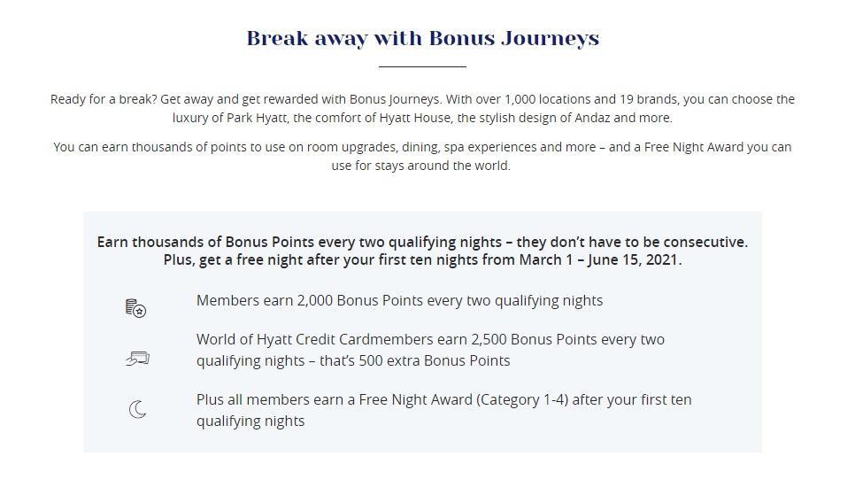 2K Bonus Points: You must be a member of World of Hyatt and register for the promotion between February 23, 2021 and May 15, 2021 to participate. To join World of Hyatt, visit worldofhyatt.com, and to register for the promotion, visit hyatt.com/bonusjourneys. Only Eligible Nights completed after registration and between March 1, 2021 and June 15, 2021 (“Promotion Period”) will count toward this promotion. Beginning on your first eligible stay after registration, you will receive 2,000 Bonus Points for every two (2) Eligible Nights at Hyatt hotels and resorts worldwide and participating M life Rewards destinations, Small Luxury Hotels of the World (“SLH”) properties, and Lindblad Expeditions.