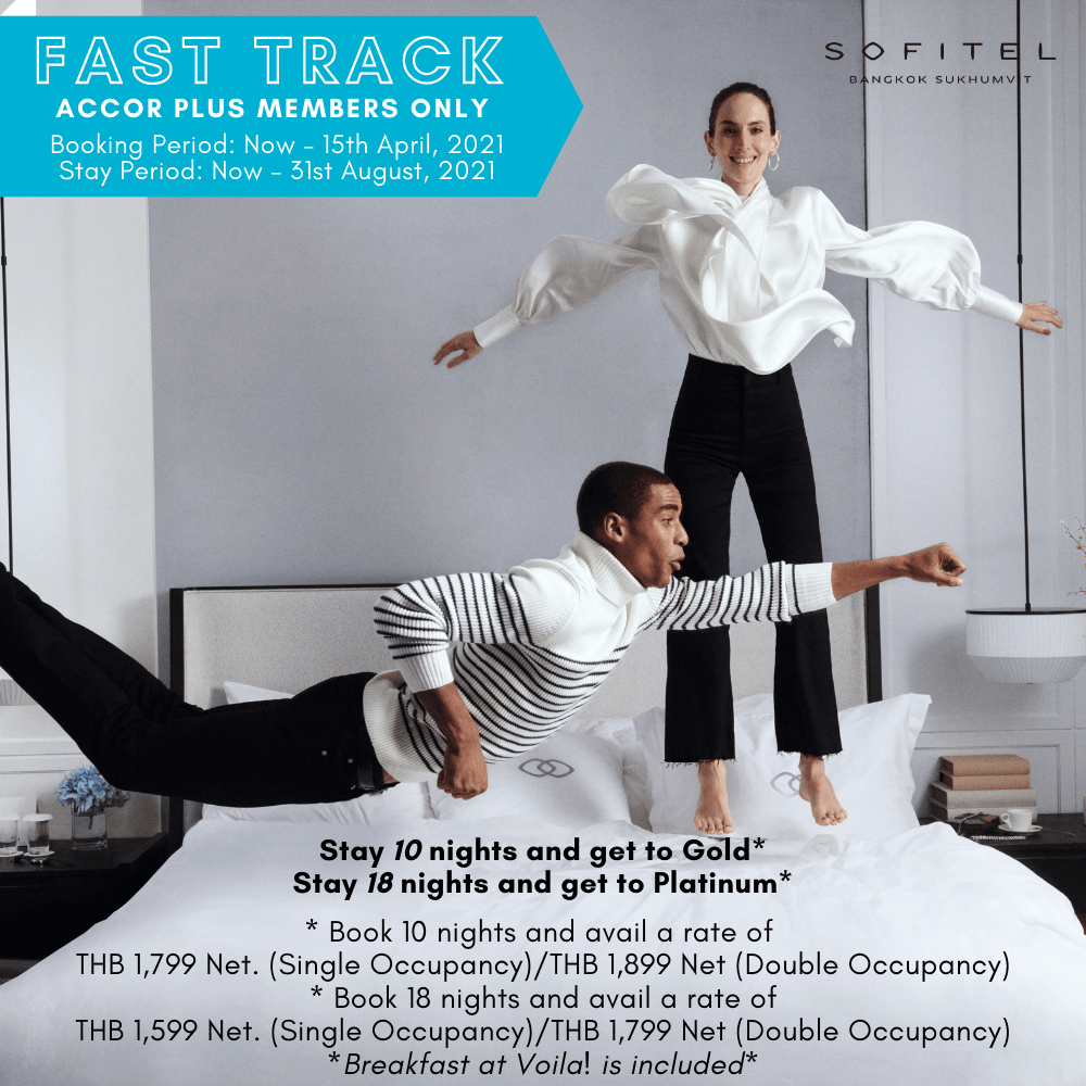 โซฟิเทล กรุงเทพ สุขุมวิท ขอเสนอโปรโมชั่นสุดเอ็กซ์คลูซีฟสำหรับสมาชิกแอคคอร์ พลัส – ซิลเวอร์และโกลด์ ที่จะได้สถานะที่สูงขึ้นในจำนวนคืนที่เข้าพักที่น้อยลงด้วยโปรโมชั่น “Fast Track” ที่สมาชิกจะได้รับราคาสุดพิเศษเมื่อจองห้องพักจำนวน 10คืน/18 คืนกับเรา เพื่อที่จะอัพเกรดสถานะของคุณให้สูงขึ้น