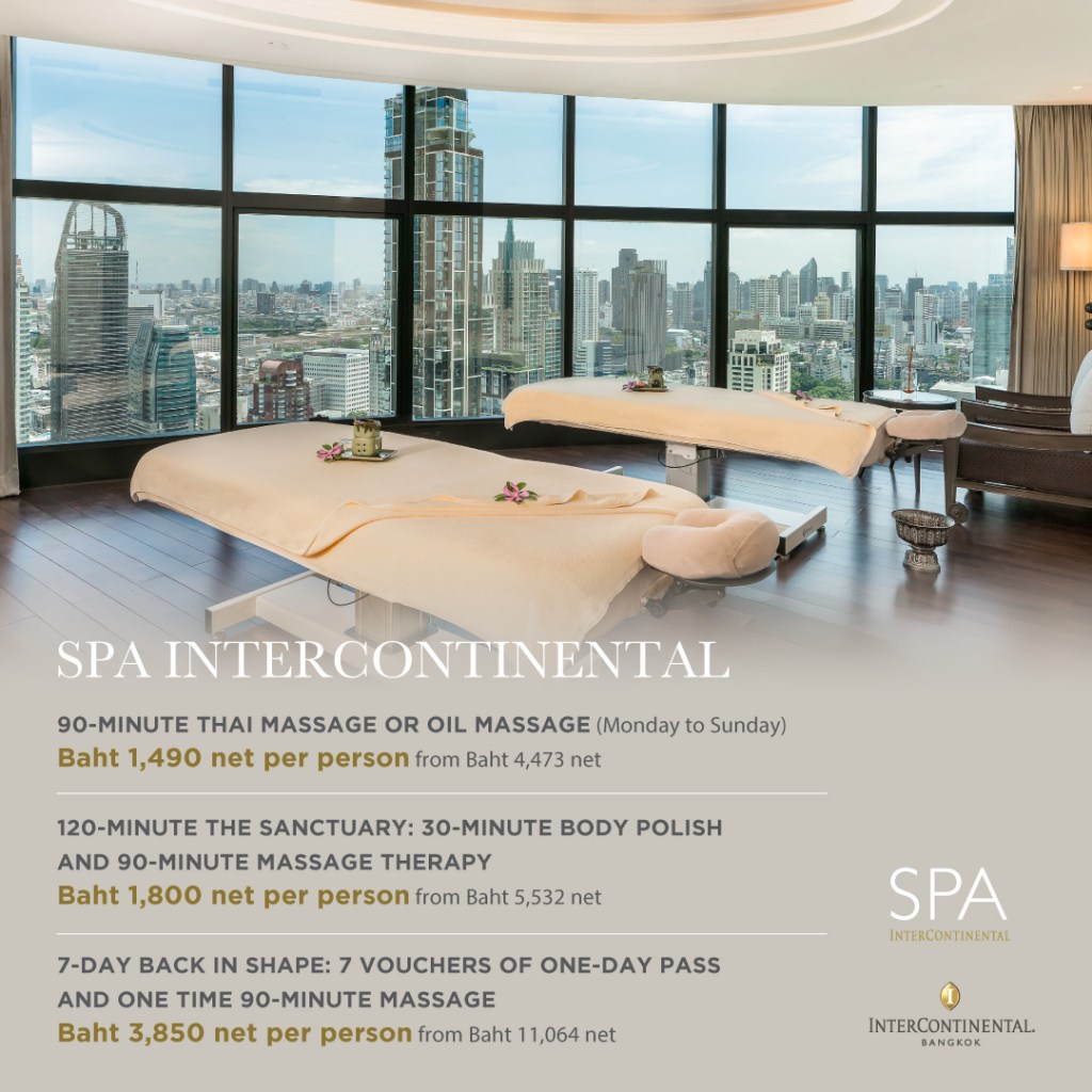 • ส่วนลด 50% สำหรับสปาเมนูปกติ และส่วนลด 30% สำหรับแพ็กเกจสปา ณ สปา อินเตอร์คอนติเนนตัล