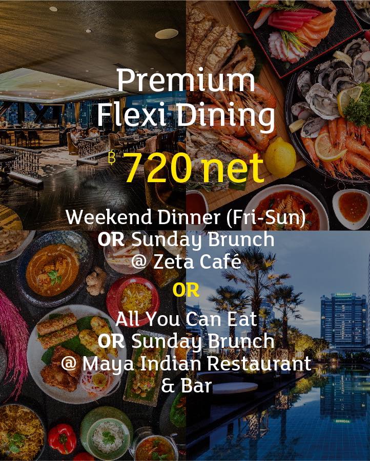 🥄Premium Flexi Dining มื้อเย็นวันหยุดสุดสัปดาห์ ศุกร์ – อาทิตย์ หรือจะ Sunday Brunch ฿720 net. ที่คุณจะเพลิดเพลินอิ่มอร่อยไปกับอาหารมากมาย รวมไปถึง Weekend Seafood on Fire เมนูซีฟู้ดที่เราจะเอามาย่างให้คุณได้ลิ้มรสอาหารทะเลสดๆ ที่ Zeta Cafe หรือจะเปิดประสบการณ์ไปกับอาหารอินเดียแบบ All You Can Eat ที่ Maya Restaurant & Bar