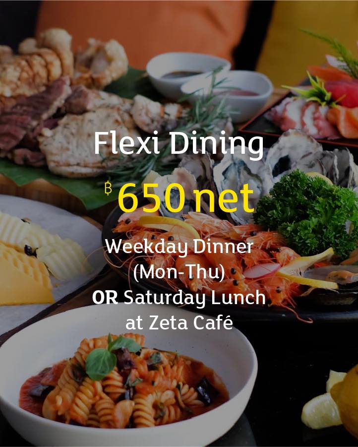 🥄Flexible Dining Voucher ฿650 net. เลือกรับประทานอาหารบุฟเฟ่ต์อาหารนานาชาติ มื้อเย็นวันธรรมดา จันทร์ – พฤหัส หรือ Saturday Lunch ที่ Zeta Cafe
