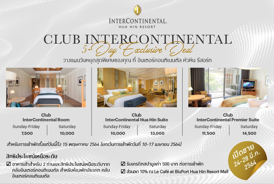 📣 Plan your luxurious weekend Hua Hin getaway in any types of our luxurious Club InterContinental® Hua Hin and get an exclusive add-on benefit and Club InterContinental® privilege with special price offer starts from 𝐓𝐇𝐁 𝟕,𝟓𝟎𝟎 𝐧𝐞𝐭 #5DaysOnly.