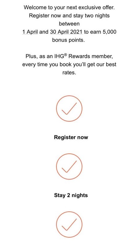 Must be an IHG® Rewards member and must be invited to participate in Just For You: Stay 2 Nights, Get 5,000 Bonus Points (“Offer”). 5,000 bonus points will be deposited into your account after completing 2 qualifying nights between April 1, 2021, and April 30, 2021 (“Offer Period”), at InterContinental®, Crowne Plaza®, Hotel Indigo®, Holiday Inn ®, Holiday Inn Express®, Staybridge Suites®, Candlewood Suites®, Kimpton®, EVEN®, avidTM , vocoTM , Regent® Hotels & Resorts, Principal® Hotels, or HUALUXETM hotels worldwide.