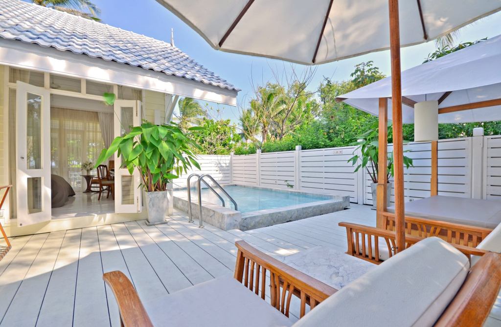 พักผ่อนในวิลลาส่วนตัวขนาด 76 ตร.ม. ตกแต่งโทนสีขาวสบายตาพร้อมพื้นที่พักผ่อนเป็นสัดส่วน รวมทั้งระเบียงนั่งเล่นและสระว่ายน้ำ