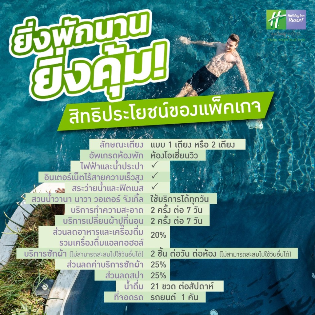 Spend more time experiencing the best spot of Hua Hin with a specially-designed package at THB 12,999 ne.- per room for 7 days and 14 days rate at THB 22,999 net.- per room, including room upgrade to Ocean View Room, unlimited access to Vana Nava Hua Hin Waterpark, 2 pieces of Laundry, Food & Beverage discount and many more.