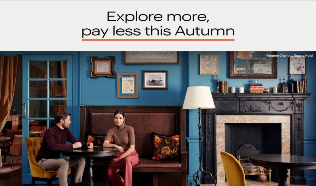 The Autumn Savings 2021 Europe promotion (the “Promotion”) is valid only for selected bookings made from 14 September 2021 to 27 September 2021 (both dates inclusive) (the “Booking Dates”) for stays at participating IHG® branded hotels in the UK and Europe between 17 September 2021 and 31 May 2022 (the “Stay Dates”) using the “Advance Saver” or “Advance Saver – IHG® Rewards Member Rate” during the Booking Dates.