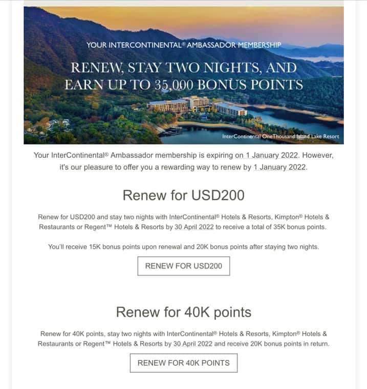 If you renew your InterContinental® Ambassador membership by paying USD200, you will receive 15,000 IHG® Rewards points upon renewal. An additional 20,000 bonus points will be deposited into your account after you stay two qualifying nights, between your renewal date and 30 April 2022, at participating InterContinental® Hotels & Resorts, Kimpton® Hotels & Restaurants, or Regent® Hotels & Resorts.