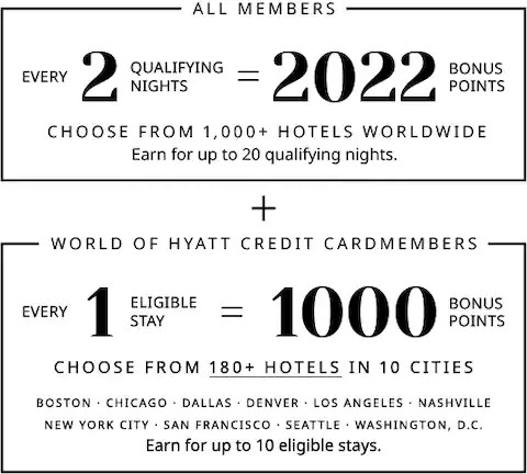 Bonus Point Offer: You must be a member of World of Hyatt in good standing and register for the promotion between December 8, 2021 at 12:00 a.m. CST and March 15, 2022 at 11:59 p.m. CST to participate. To join World of Hyatt, visit worldofhyatt.com, and to register for the promotion, visit hyatt.com/bonusjourneys. Only Eligible Nights completed after registration and between January 15, 2022 and April 20, 2022 (“Promotion Period”) will count towards this promotion. Eligible nights must be on stays completed by April 20, 2022. Beginning on your first eligible stay after registration during the Promotion Period, you will receive 2,022 Bonus Points for every 2 Eligible Nights at participating Hyatt hotels and resorts worldwide and participating M life Rewards destinations, Small Luxury Hotels of the World (“SLH”) properties, and Lindblad Expeditions. A maximum of 20,220 Bonus Points may be earned under this promotion.