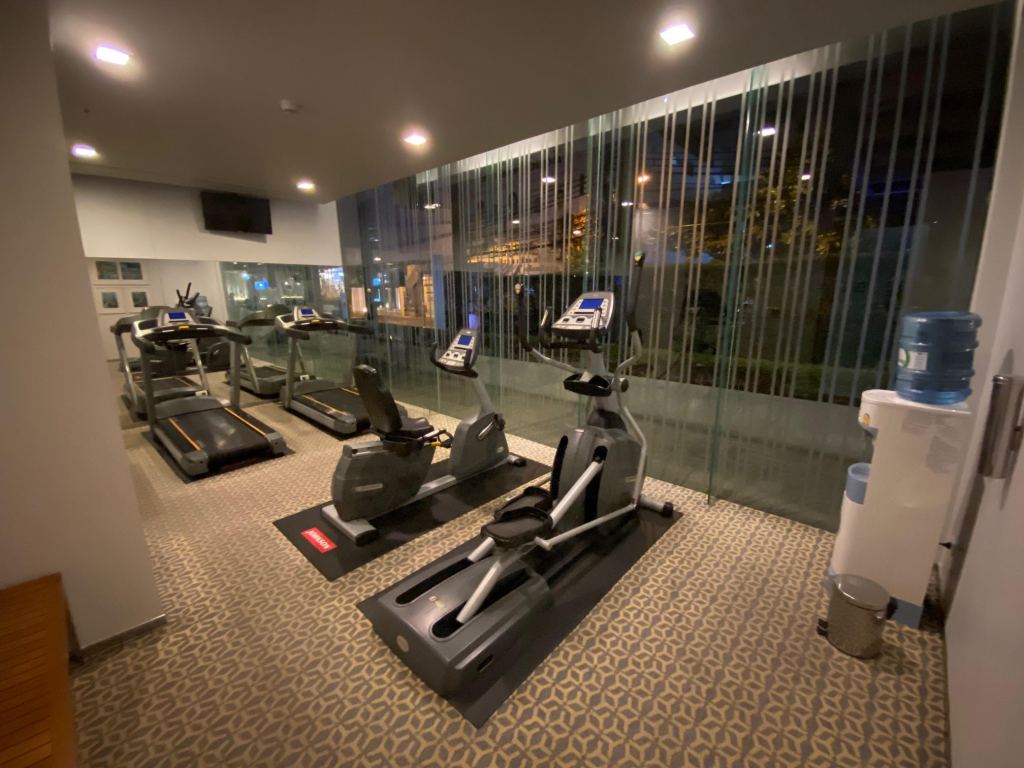 ฟิตเนส มี ลู่วิ่ง และ ดัมเบลเล็กๆ อยู่ชั้น 1