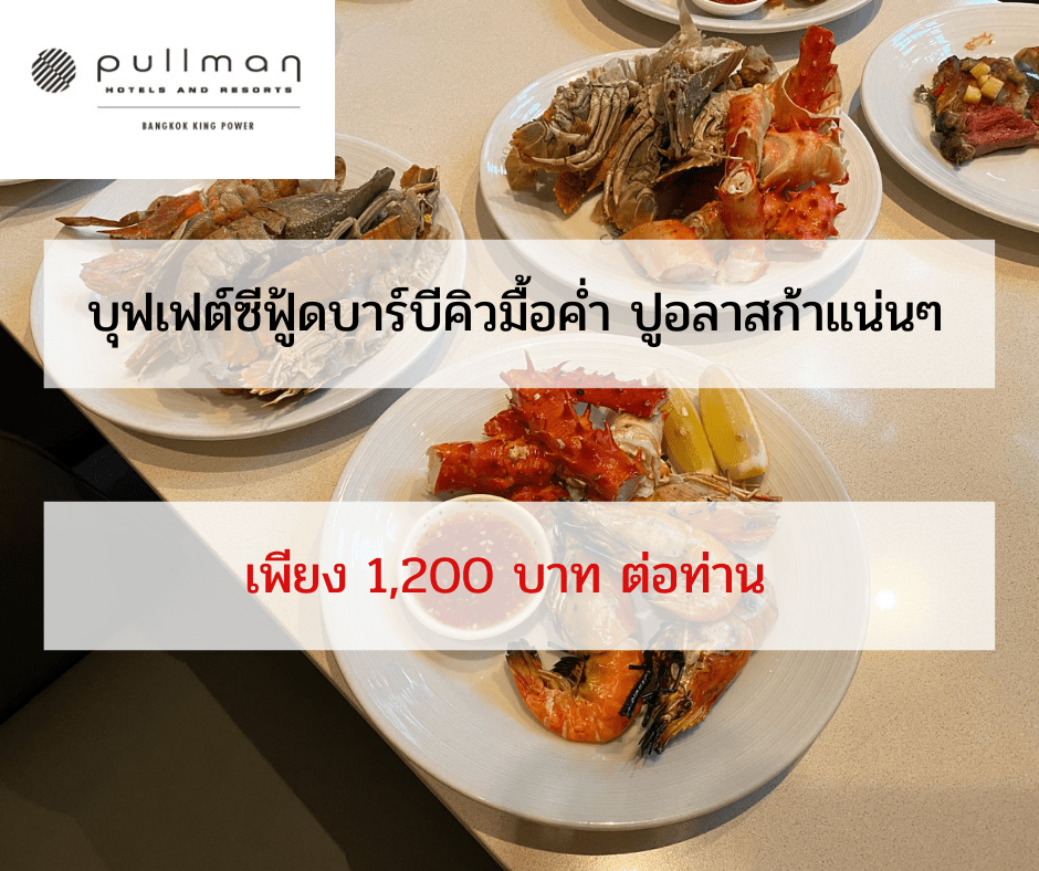 - ซื้อ 10 แถม 1 บุฟเฟต์ซีฟู้ดบาร์บีคิวมื้อค่ำ เพิ่มปูอลาสก้าและเนื้อโทมาฮอลค์ ณ ห้องอาหารควิซีน อันปลั๊ก เฉพาะวันพฤหัสบดี – วันอาทิตย์ ราคา 1,200 บาทสุทธิ รวมน้ำดื่ม 1 ขวด คลิกซื้อ https://bit.ly/3yql1eQ