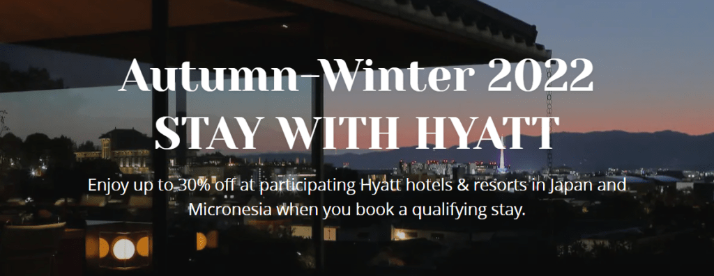 Enjoy up to 30% off if you are a World of Hyatt member or up to 25% off for non-members when you book qualifying stays at participating Hyatt hotels & resorts in Japan and Micronesia between August 17, 2022 and August 30, 2022 and stay between September 8, 2022 and December 20, 2022. Use Offer Code AUTUMN at the time of booking. Terms and conditions apply.