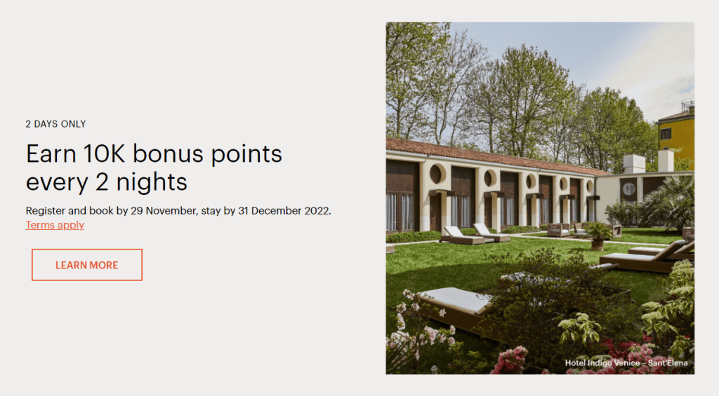 This “10,000 Points for Every 2 Nights” promotional offer (the “Promotion”) gives IHG One Rewards members the opportunity to earn 10,000 IHG One Rewards bonus points each time they complete two (2) qualifying room nights at participating hotels during the “Promotion Period” (defined below). To participate in this Promotion, a member must both register for the Promotion and book their qualifying room night stays during the “Activation Period”. The “Activation Period” is 28 November 2022 (12:00 AM Local Standard Time) until 29 November 2022 (11:59 PM Local Standard Time) only. Only qualifying room nights booked during the Activation Period after the member has registered are eligible for the Promotion. A member can only register once, and by registering for the Promotion, a member is accepting these Terms and Conditions.