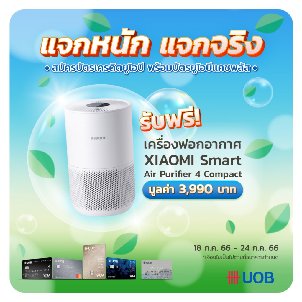 • สำหรับลูกค้าที่ได้รับการอนุมัติ บัตรเครดิตยูโอบีพรีวิไมลส์/พรีเมียร์/พรีเฟอร์/โยโล่ แพลทินัม/เลดี้ โซลิแทร์/เลดี้ แพลทินัม บัตรหลัก จะได้รับเครื่องฟอกอากาศ Xiaomi Smart Air Purifier4 Compact มูลค่า 3,990 บาท 1 เครื่อง โดยลูกค้าต้องมียอดการใช้จ่ายผ่านบัตรเครดิตยูโอบีที่ได้รับการอนุมัติ ตั้งแต่ 10,000 บาทขึ้นไป ภายใน 30 วัน นับจากวันที่ธนาคารอนุมัติบัตรเครดิต