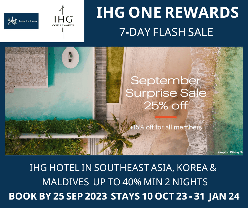 The ‘SEPTEMBER FLASH SALE’ promotional rate (the “Promotion”) is valid only for selected bookings made from 19 to 25 September 2023 (both dates inclusive) (“Booking Dates”) for stays at participating IHG branded hotels between 10 October 2023 to 31 January 2024 (both dates inclusive) (“Stay Dates”) using the ‘SEPTEMBER FLASH SALE’ rate during the Booking Dates.