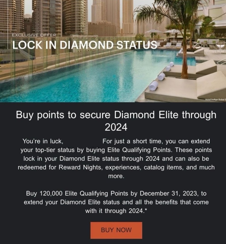 *This Offer is available to IHG One Rewards members for qualifying purchases of IHG One Rewards Elite Qualifying Points made during the period from 12:00 AM ET November 16, 2023 and 11:59 PM ET December 31, 2023 inclusive. A member may only purchase Elite Qualifying Points once under this promotion. Purchased Elite Qualifying Points will count toward a Member’s Year-To-Date status qualifying points balance (for example, towards Diamond Elite tier status for 2024).The Member must purchase enough to either meet or exceed the Diamond Elite Qualifying Points threshold to maintain Diamond Elite status through all of the 2024 calendar year. This offer does not apply to the yearly points purchase cap that is set at 150,000 points during a calendar year. Elite Qualifying Points will be awarded upon completion of the transaction, and new Elite status will be reflected within 5-10 business days. Renewed Diamond Elite status gained from the purchase of Elite Qualifying Points will be valid for the remainder of 2023 and all of the 2024 calendar year. Elite Qualifying Points and resulting status will be awarded to the recipient of the Elite Qualifying Points purchase only. Price includes all applicable fees. Elite Qualifying Points are non-refundable and are applicable toward all IHG One Rewards awards. Elite Qualifying Nights are not part of this offer and cannot be purchased. This is an exclusive, non-transferable offer for intended recipients only and may not be forwarded. Offer is subject to change.