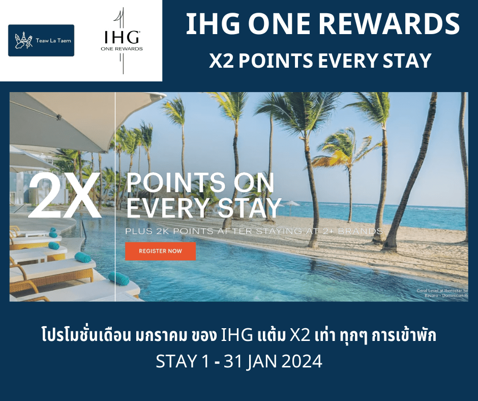 IHG One Rewards : X2 Points Every Stay Stay 1 – 30 Jan 2024