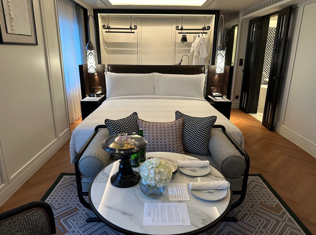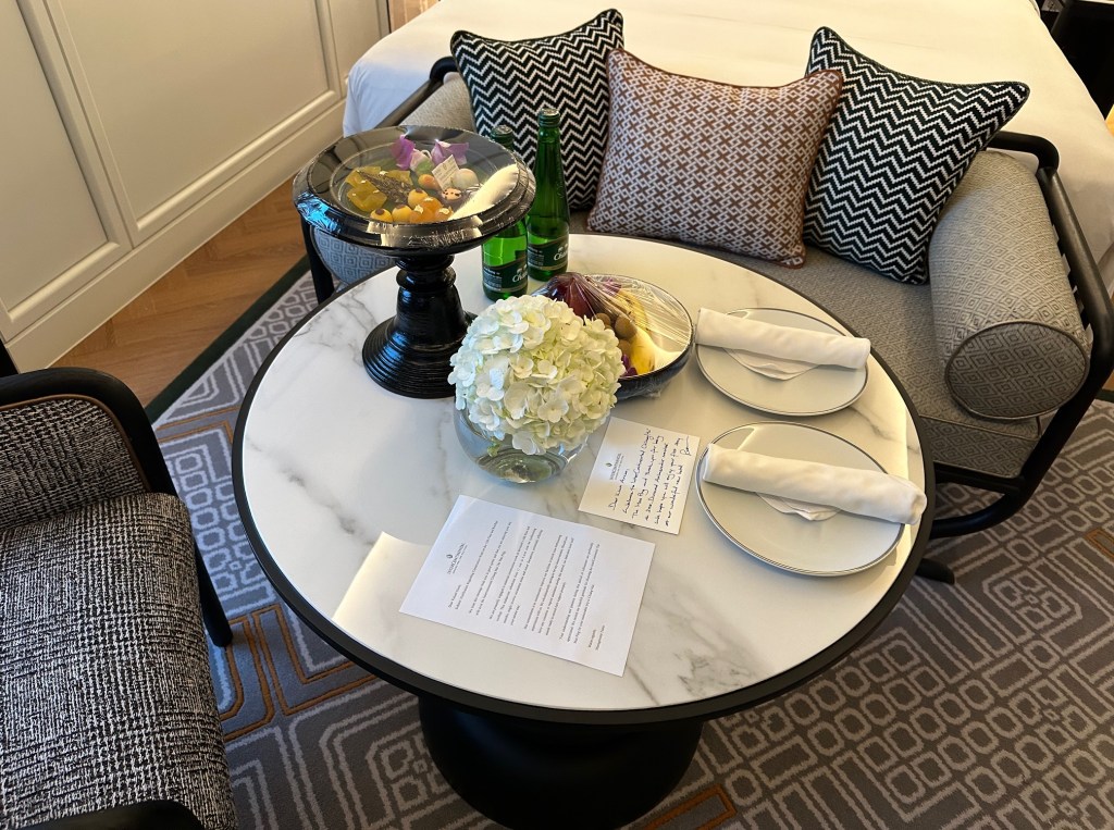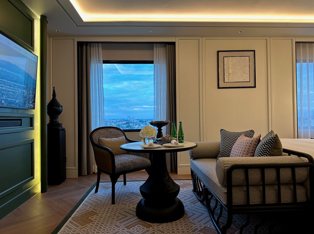 At the foot of the bed is a sofa and a dining table. The sofa is very comfortable, and there is a welcome fruit platter and Thai sweets, which are beautifully arranged. There is also bottled water for Ambassador members.