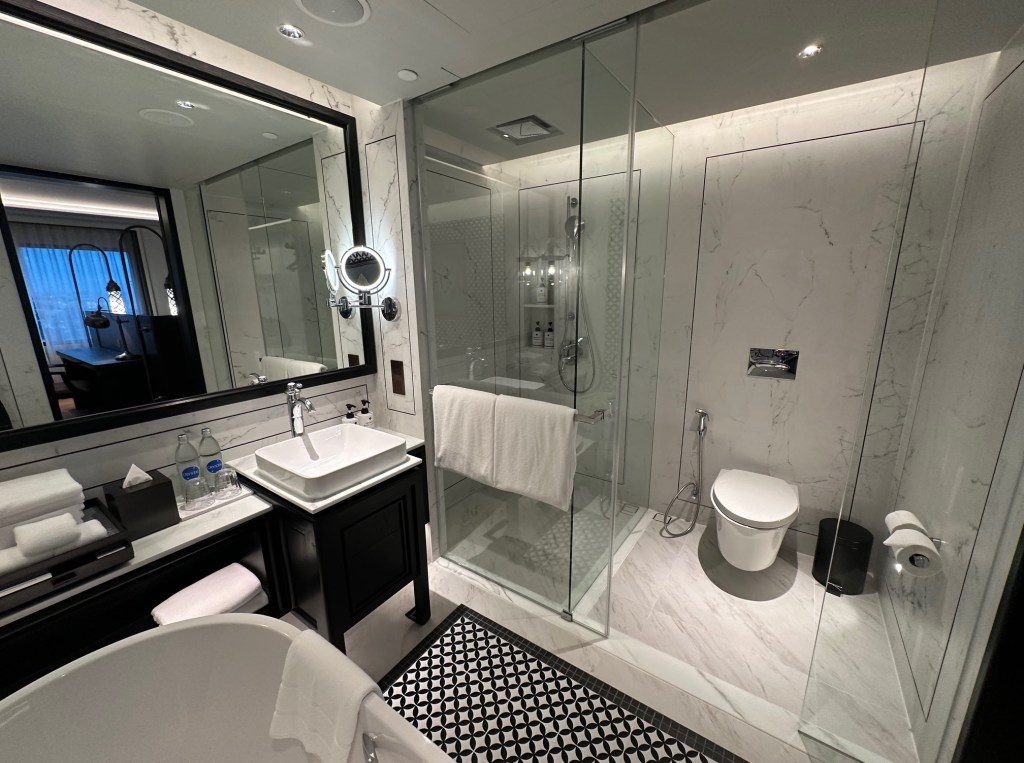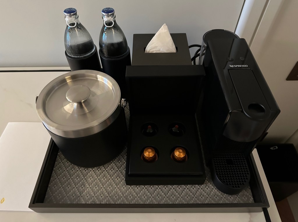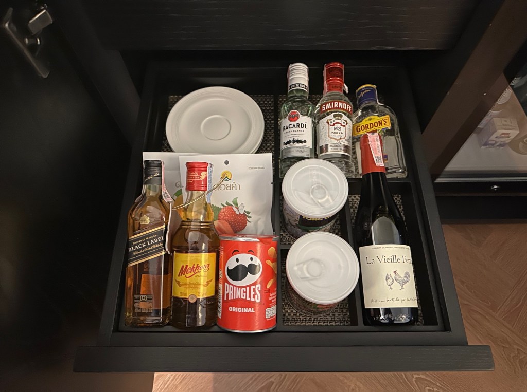 The room opens to a minibar on the right-hand side, which also has a hidden cabinet for storing an iron and a flashlight. The room comes with a Nespresso coffee machine, and the tea is Monteaco, a Thai brand. The minibar is well-stocked, but drinks are chargeable.